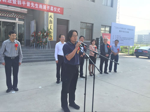 中国国家画院国画院秘书长 陈鹏讲话 东河扬波迎嘉宾,文化盛会促发展。6月1日,“三区人才支持计划”中国画培训班暨郭平晋画展在成县同谷书画院开幕。省文化厅副厅长杨建仁,国家画院秘书长陈鹏,省文化厅艺术处处长孙来军,省文化艺术研究所所长顾善忠,陇南市副市长李兴华,市文广新局副局长茹涛。成县县委副书记、县长李鹏军,县委常委、副县长吕红菊,同谷书画院院长杨立强及成县在家四大班子领导出席开幕仪式。开幕仪式由成县县委常委、宣传部长李德录主持。
