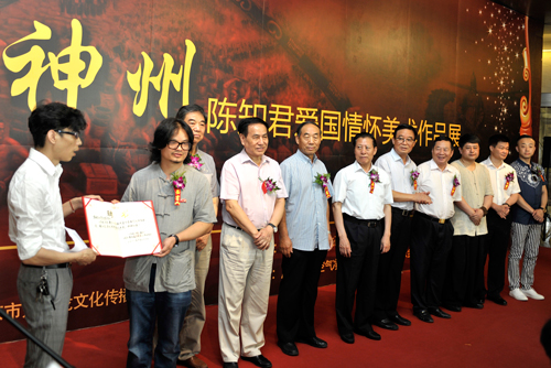 ![]() 圆梦神州---陈知君爱国情怀美术作品展开幕式现场 6月26日上午10时,由天雨飞翔(北京)文化传媒有限公司主办,中华炎黄文化研究会砚文化联合会、闻博书画院、天雨斋艺术工作室协办、广东云联惠网络科技有限公司、北京市楚天龙文化传播有限公司承办的以《大国醒——虎门风云》为主体的“圆梦神州——陈知君爱国情怀美术作品展”在中华世纪坛东方厅隆重开幕,展览将持续到29日。 ![]() 圆梦神州---陈知君爱国情怀美术作品展开幕式现场 此次爱国画家陈知君个人画展,是为了“6·26国际禁毒日”而举办,目的为了呼吁大家“远离毒品、珍爱生命”。参加开幕式并发言的嘉宾有:全国政协常委、原文化部常务副部长高占祥同志;全国政协委员,中华炎黄文化研究会砚文化联合会会长、原中国人民武装警察部队副司令员刘红军中将;中华炎黄文化研究会理事,中华炎黄文化砚文化联合会常务副会长许世宽少将;中华炎黄文化研究会理事,中华炎黄文化研究会砚文化联合会常务副会长魏哲少将;中国人民革命军事博物馆政委孟世强少将;原解放军艺术学院政委周小献先生;中国将军部长书画院副院长陈先春少将,陶行知教育基金会会长崔祖英先生;广东云联惠董事长黄明先生;中国文联书画交流中心主任邱长海;著名学者,书法篆刻家,原青岛理工大学副校长张光兴先生;中华炎黄文化研究会砚文化联合会副会长于江先生;国际禁戒毒万里善行巡演组委会总导演杨代忠;著名喜剧演员、中央电视台主持人何军先生;著名演员、东京电影节影帝王宇先生等等。刘红军会长、张光兴校长等嘉宾做了精彩和热情的发言。最后,陈知君先生做了真诚和感恩的发言。展览由著名艺术策展人、导演、天雨斋艺术工作室艺术总监李涛先生策划并主持。参加展览还有众多政界、商界、文艺界、媒体界等各领域嘉宾300多位。 ![]() 圆梦神州---陈知君爱国情怀美术作品展开幕式现场 毕业于中央美术学院徐悲鸿油画研究班的陈知君曾担任中国文联书画艺术交流中心副主任、中国书画家协会副理事长等职务,近年来笔耕不辍,多幅作品在各项大赛中获奖,其中油画作品《大熊猫》先后入选北京紫光阁国礼中心和北京天安门城楼收藏,2013年油画作品《毛主席回韶山》被韶山毛泽东同志纪念馆永久收藏。此次中华世纪坛东方厅展出作品除了《大国醒—虎门风云》这个巨幅画作外,展出的作品既有名人、甚至一些领袖的肖像画作,也有一些普通劳动者的身影、动物、风景和部分国画作品。“陈知君努力吸吮写实画风文化营养,在精神层面,注重艺术关注现实和富有情趣地表现生活;在技艺层面,努力提高自己的造型技巧,锤炼油画语言,尤其在形体结构和色彩方面下功夫。”全国政协委员、中华炎黄文化研究会砚文化联合会会长、原武警部队副司令员刘红军中将,这样评价陈知君的画作。此次在中华世纪坛东方厅举办的个人画展,则是陈知君做为一名中国画家向祖国母亲、以及建党95年周年汇报了自己阶段性的艺术创作成果。据悉此次画展引发了媒体界包括中央电视台、北京电视台、人民网、新华网、光明网、中新网、中国网、凤凰视频、搜狐视频、新浪视频等一千多家媒体争相报道。 ![]() 画家陈知君为嘉宾介绍作品 陈知君先生创作的《大国醒——虎门风云》正是以“虎门销烟”为背景而创制的一副巨作。一个多世纪来,反映这一历史事件的作品并不鲜见,其作品可谓别具一格——开阔的视野、精巧的构思、宏大的场景、泼辣的用笔、丰富的色彩,充分展示出他独特的绘画语言,也寄托了画家深沉的爱国情怀与追求正义的精神,正所谓“笔墨之外,别具怀抱”,同时,此一题材也体现了优秀的文化传统与现代绘画理念的有机结合。其中国梦意蕴的东方巨制与传承开拓艺术新气象的文化自觉展示了画家高尚的爱国情操与深沉的艺术大爱精神! (责任编辑:卓艺梵程) |