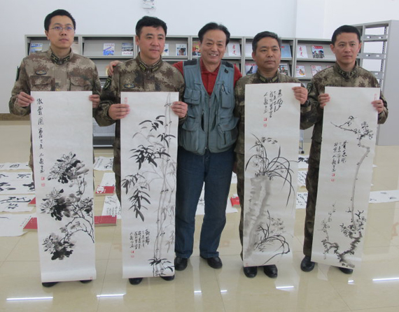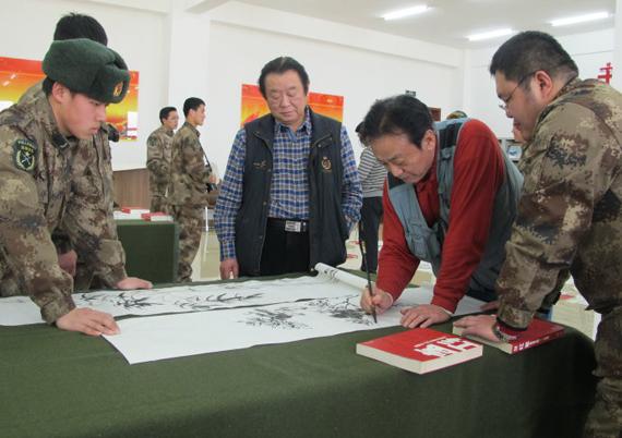 ![]() 送书画到军营 2015年3月12日,在原沈阳军区政治部副主任韩锡平将军的安排和率领下,以韩锡平将军和人民美术网总编李人毅领衔,由书画家、作家、民营企业家、退休老军人组成的慰问团,来到某部军营进行走访慰问。 ![]() 韩锡平将军和画家李人毅在军营 期间,在军营新建的文化中心的图书馆里与官兵一起交流读书体会。 书画家张建新、田野、宋琦等当场挥毫作画,为装点新营房献艺。韩锡平还当场赋诗一首:“雄师虎旅强中强,声震四方威名扬。而今旧盘立新营,利剑巍巍射天狼!”由李人毅写成书法赠送给部队,受到官兵的热烈欢迎。 ![]() 韩锡平将军参观军营 大家还参观了军营文化中心的网络室,人民美术网总编李人毅还在现场上网搜索点击到了人民美术网主页,向大家介绍了网络艺术媒体的发展趋势和在繁荣文化传播 正能量中的作用。使大家对人民美术网有了进一步的了解。来访的老军人和民营企业家在军营深有感触,大家为有强大的人民军队感到自豪。 ![]() 慰问团全体成员合影 ![]() 中国美协会员著名画家张建新为军营添墨宝 ![]() 著名书画家田野在写书法 ![]() 韩锡平将军赋诗,和李人毅等在推敲。 ![]() 由韩锡平将军作诗、李人毅书写的书法作品,赠给了军营。 诗文为: 雄师虎旅强中强, 声震四方威名扬。 而今旧盘立新营, 利剑巍巍射天狼! ![]() 画家、人民美术网总编辑李人毅画的四君子四条屏 ![]() 来宾参观军营网络室,战士不到地方网吧就可以上网。右三是女画家刘波,左一是画家宋琦,左二是韩锡平将军。 ![]() 画家、人民美术网总编李人毅打开人民美术网主页,浏览资讯栏目,介绍艺术媒体的情况。 ![]() 画家、人民美术网总编李人毅与同年入伍的于得水将军在军营漫步,两人是初中同学,都是从农民入伍,成为职业军人。 (责任编辑:卓艺梵程) |
