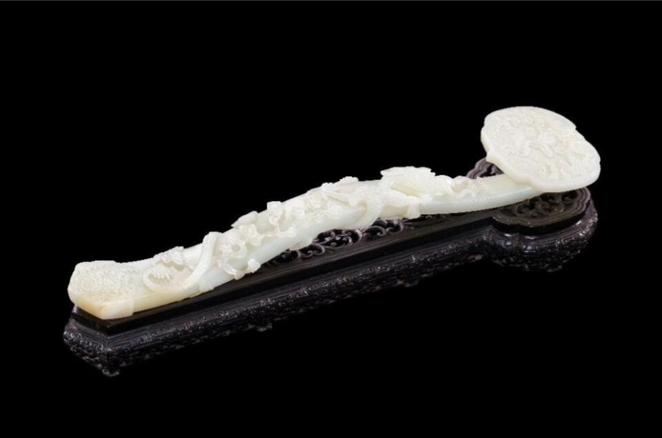 德安堂藏玉 市场上历来最上乘的清代玉器收藏 领衔拍品 清乾隆 御制白玉赶珠云龙纹题诗如意 估价:6,000 至 8,000 万港元