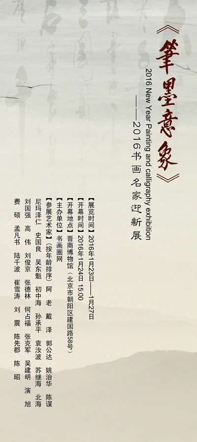 邀请函 展览主题:《笔墨意象》2016书画名家迎新展 展览时间:2016年1月23日——27日 开幕时间:2016年1月24日 下午三点 开幕地点:北京晋商博物馆(北京市朝阳区建国路58号) 主办单位:书画圈网 参展艺术家:(按年龄排序)阿老 戴泽 郭公达 姚治华 陈谋 尼玛泽仁 史国良 吴东魁 初中海 孙承平 袁汝波 苏继海 北海 刘国强 高伟 刘俊京 张德林 何占福 张克军 吴建明 演旭 费硕 孟凡书 陆千波 崔雪涛 刘震 陈先郡 陈昭 2016年1月24日 下午三点,目前世界上规模最大、馆藏最为丰富的晋商专题博物馆将迎来阿老、戴泽、郭公达等数十位国内知名艺术家。这是(2016年)丙申年来临之际,由书画圈网特别举办的书画名家迎新展览。 2015年是不平凡的一年,在这年,迎来了中国人民的抗战胜利70周年,更是文艺座谈会召开后的艺术界新元年,在这一年里,书画圈网看到了书画界呈现出的百花齐放、百家争鸣之象,更是体会到了各位书画大家在书画创作过程中其作品更接近于人民、扎根于生活的艺术创作新景象。 书画圈网特举办此次展览,以展现文艺座谈会后,各书画大家创作的心路历程,与大家分享迎新艺术大餐,同时以此答谢各界关心、支持书画圈网的各界友人。 据悉,《笔墨意象》2016书画名家迎新展形式独特,分作品专区和媒体釆访专区。其最大看点是囯内名家百余幅书画精品。这些作品涉及范围广,视觉效果好,艺术风格多样,个性鲜明突出,充分体现了艺术家创作的累累硕果。 此活动还将特邀嘉宾、中央老领导、知名画家、和社会各界人士为本次活动致开幕词,然后进行为期五天的展览。 真诚期待您的光临! 媒体支持 纸媒:中国文化报、人民日报海外版、艺术天成、国画先锋、艺术百年、艺术公社、中国书画市场报、新时代名家杂志、三品杂志、中国改革报、美术报、新时代艺术报、时尚周刊、中国美术报等 网络媒体:人民网、新华网、光明网、中国经济网、中新网、中国网、搜狐、新浪、腾讯、美术圈、中国美术大观网、环球文化艺术网、中国美术家网、中国书法家网、中国文化艺术网、华夏收藏网、99艺术网、雅昌网、博宝艺术网、东方金典艺术网、新时代艺术网、搜藏网、中国书画家影像网、书画圈网、文超文化传媒、华夏名家艺术网、印象中国网、魅艺中国网、顶点艺术网、中国艺术之梦网、中国文物网、书画村网、中华丹青网、人民美术网、翰墨千秋网、琉璃厂在线、大画家网、超艺术网 、卓颖视觉文化传媒网、军地影视网、艺美中国网、出山网、翰墨书画网、西北翰墨网、中艺书画网、中国艺术品理财网、文化艺术网、人民艺术网、宋庄365网、大家艺术网、艺栈网、东方艺术网、水墨中国等 视频:央视书画频道、国学频道、中国网、搜狐、新浪、腾讯、优酷、搜藏网视频、中国网翰墨名家、星空书画视频、中国书画艺术网视频、书画圈网视频 微信公众平台:艺术传承媒体联盟、国画先锋、艺术收藏空间、中国画坛联盟、色彩轩艺术空间、5A画廊、当代书画档案、时代名家等 艺术家简介 阿老 阿老,又名老宪洪,1920 年生,广东顺德人,擅绘画。现为中央工艺美术学院基础课教授,是中国美术家协会会员,中国老年画画研究会副会长,中国书画国际大学董 事局名誉主席、学术委员会主席。主要作品有《全中国儿童热爱您》、《跟随毛主席长征》、《延边鼓舞》等。 很多优秀作品被中南海、人民大会堂、国家博物馆及国际友人收藏。 戴泽 戴泽,重庆云阳人,1922年3月出生于日本京都。同年随其父母回国。中央美术学院资深教授;中国民主同盟书画研究会常务副会长;中国老教授协会文化艺术专业委员会副主任;中国美术家协会会员;中央美术学院徐悲鸿画室导师。 郭公达 1931年生,安徽萧县人。中国美术家协会会员,安徽美术家协会名誉主席,黄山画派重要人物。中南海、毛主席纪念堂、人民大会堂、全国政协礼堂都收藏和陈列其作品。 姚治华 当代著名画家,1932年9月2日出生,湖北省孝感市人。1949年后在湖北曾任美术编辑、美术创作员、群众美术辅导员。1961年毕业于中央美术学院中国画系。曾受教于李可染、叶浅予、蒋兆和、李苦禅等名师。毕业后留校任教。曾先后任助教、讲师、副教授、中华英才艺术研究院院长、中国画系教研室副主任、主任、教授。 陈谋 1937年生于北京。师从叶浅予、蒋兆和、李可染、刘凌沧、黄均、李斛等著名美术教育家。擅长创作人物画、青绿山水画,并精于写竹。 尼玛泽仁 1944年生,藏族,四川巴塘人。毕业于四川美术学院。为九届、十届、十一届、十二届全国政协委员,班禅画师,中央文史研究馆馆员,第六届中国美术家协会副主席,第七届、第八届中国美术家协会顾问,中国国家画院研究员、院委、顾问,中央文史研究馆书画院院委,中国画学会副会长,中国少数民族美术促进会,国家一级美术师,四川省文史研究馆副馆长,享受国务院特殊津贴专家 史国良 史国良(释慧禅)—1956年生人,中国当代著名人物画家,1980年毕业于中央美术学院国画系研究生班。国家一级美术师,中国美协会员,中央美院及首都 师大美术系客座教授。作品《刻经》荣获第23届蒙特可罗国际现代艺术大奖赛“联合国科教文组织大奖”,为此又受到中华人民共和国文化部荣誉嘉奖。他的画风 以写实手法,反映时代生活为主,功底扎实,笔墨厚