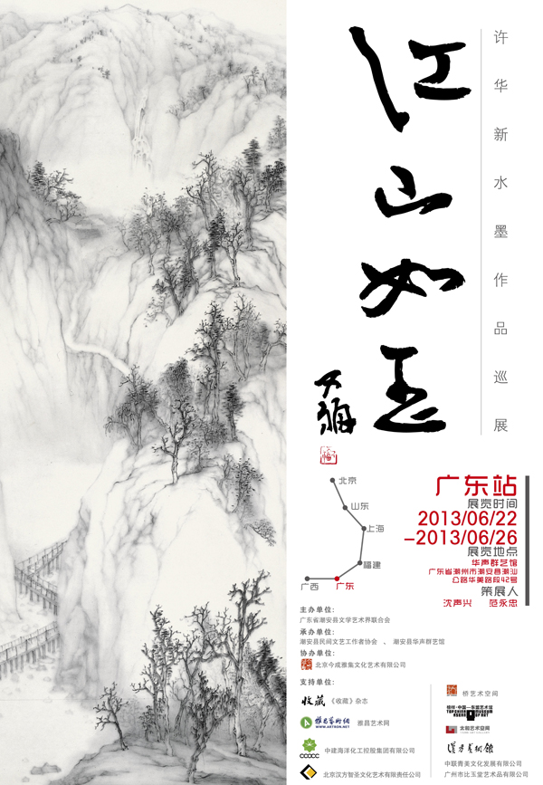 由广东省潮安县文学艺术界联合会主办的“江山如玉”—2013许华新水墨作品巡展•广东站”展览将于2013年6月22日在广东省潮州市潮安县华声群艺馆开幕,展期为6月22日——6月26日。届时欢迎光临指导!
