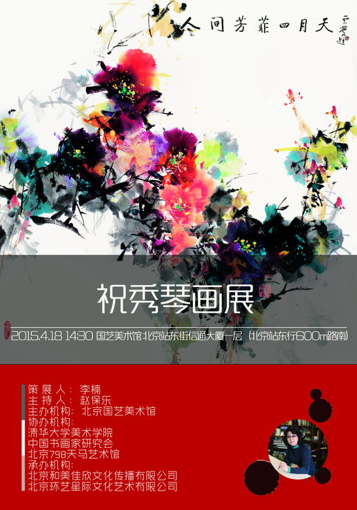 展览海报 展览名称:人间芳菲四月天祝秀琴画展 展览时间:2015-04-18 - 2015-05-18 展览城市:北京 - 北京 展览地点:北京国艺美术馆 主办单位:北京国艺美术馆 承办单位:北京和美佳欣文化传播有限公司、北京环艺星际文化艺术有限公司 协办单位:清华大学美...