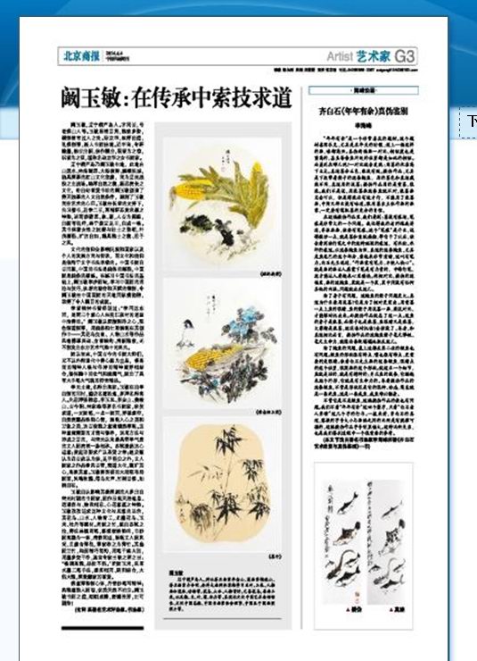 6月4日的《北京商报》发表了题为《阚玉敏:在传承中索技求道》的评论文章,详细介绍和点评了女画家阚玉敏的书画艺术。文章的作者为著名艺术评论家、书法家玄阿。
