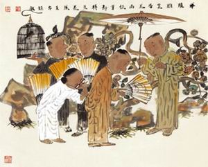 近现代我国画坛南北阵营分明,各领风骚,既有盟主坐于帐内,指挥若定,“运筹帷幄中,决胜千里外”,更有骁将冲锋陷阵,“三通金鼓响,须臾得胜还”。上世纪三四十年代,张大千与齐白石齐名,称“南张北齐”,又与北方山水画大师溥心畲并称“南张北溥”。当今画坛,北京有擅长谢老北京风情的画家马海方,画天桥的庙会,各行各业,各色人等,活灵活现,生动至极,写胡同风俗,世相百态,入木三分。历史文化名城、江南鱼米之乡苏州,则有苏州国画院院长、苏州美术家协会副主席周矩敏,以创作《姑苏情韵·百俗图》蜚声画坛,近年来更以描绘上世纪前、中叶苏州市民生活场景为突破口,开辟了人物画“画故乡情、上辈人、身边事”的新路子,以独特的视角、多变的手法、真挚的情愫向观众呈现出那个时代人们的生存环境、精神理念、处世哲学,给中国画坛吹来一股清新、质朴之风。周、马两位丹青妙手南北呼应、一唱一和,演奏了一曲曲美妙的人间乐章,不回避苦难,不粉刷太平,再苦辣酸甜中忠实记录那过去的岁月沧桑和大众的期盼、希冀,因此,就多了几分历史的厚重感和美学的思辨性。